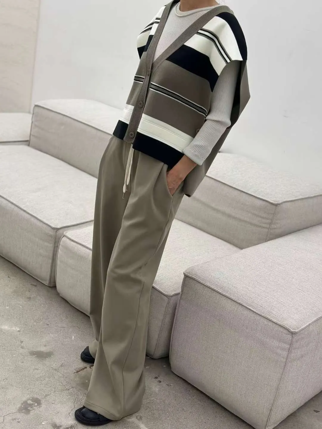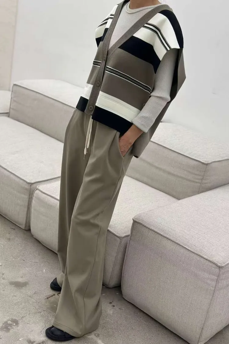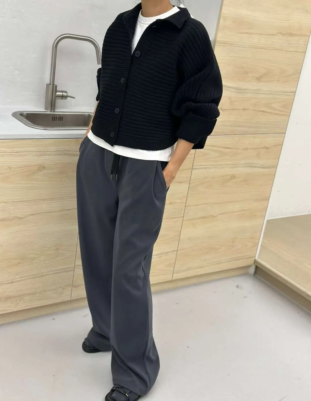 雙側口袋壓褶磨毛寬褲