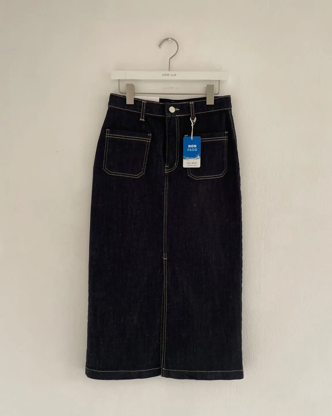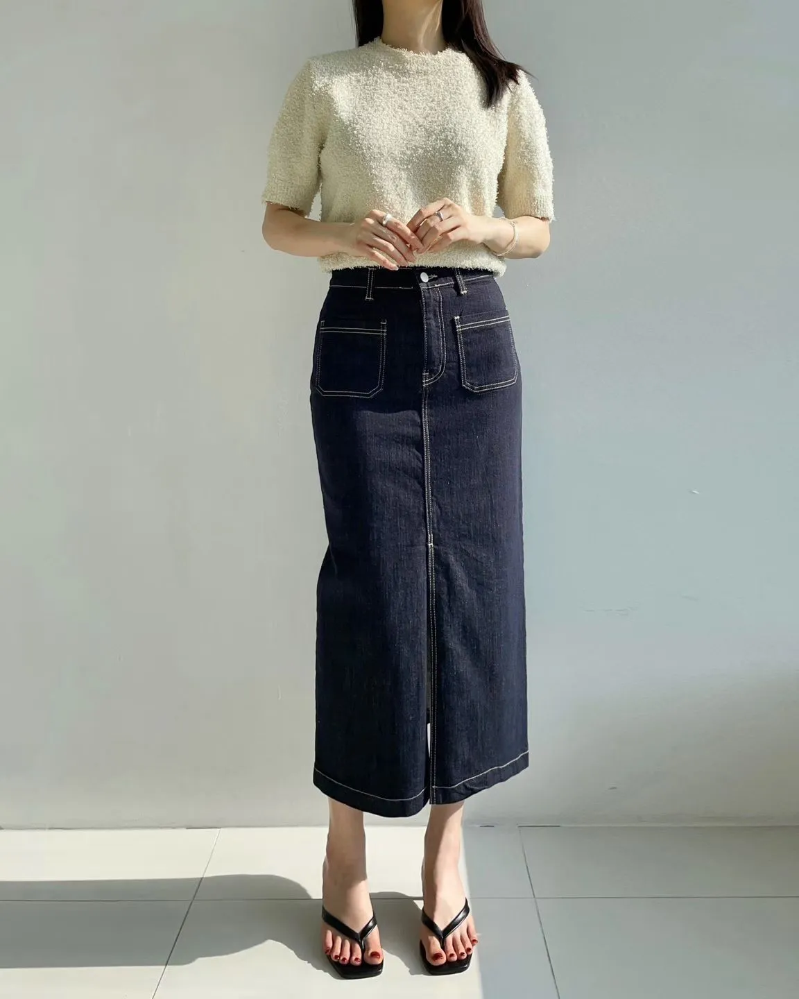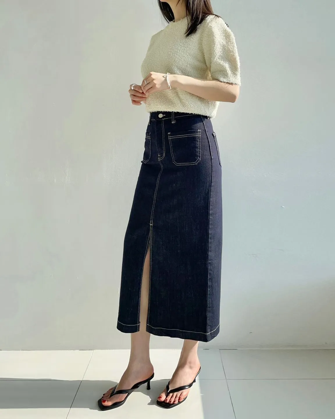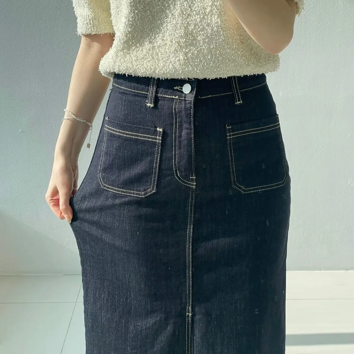 方形口袋車線前開杈牛仔裙