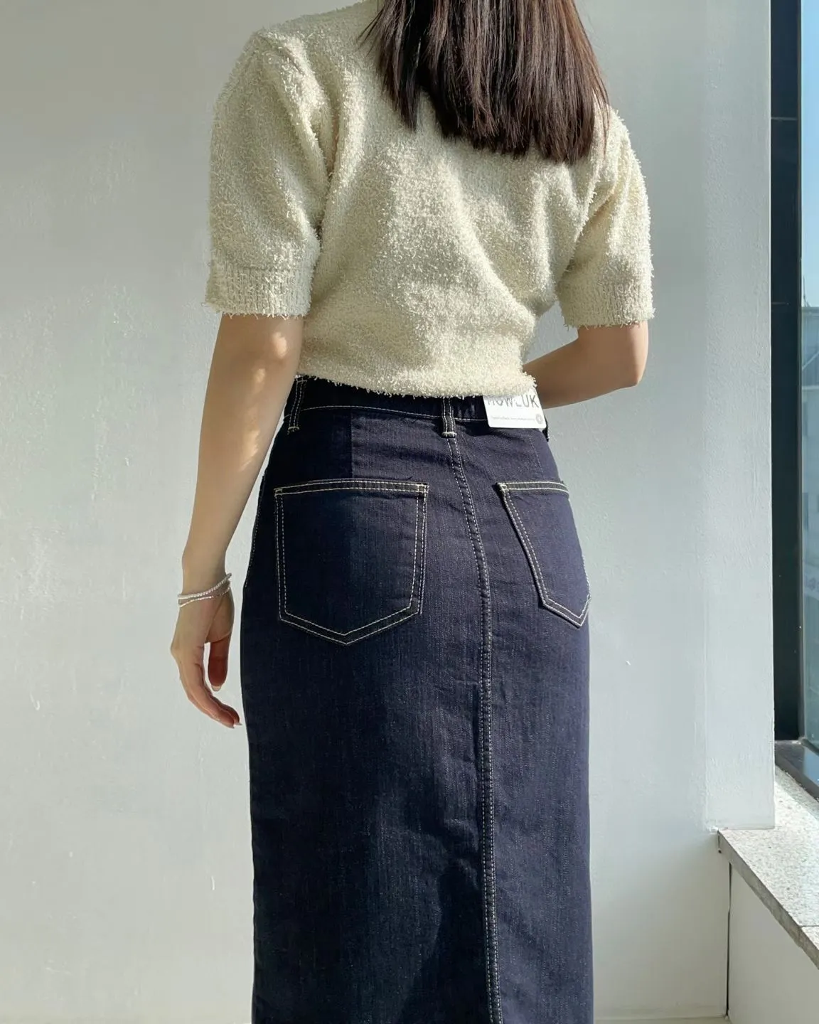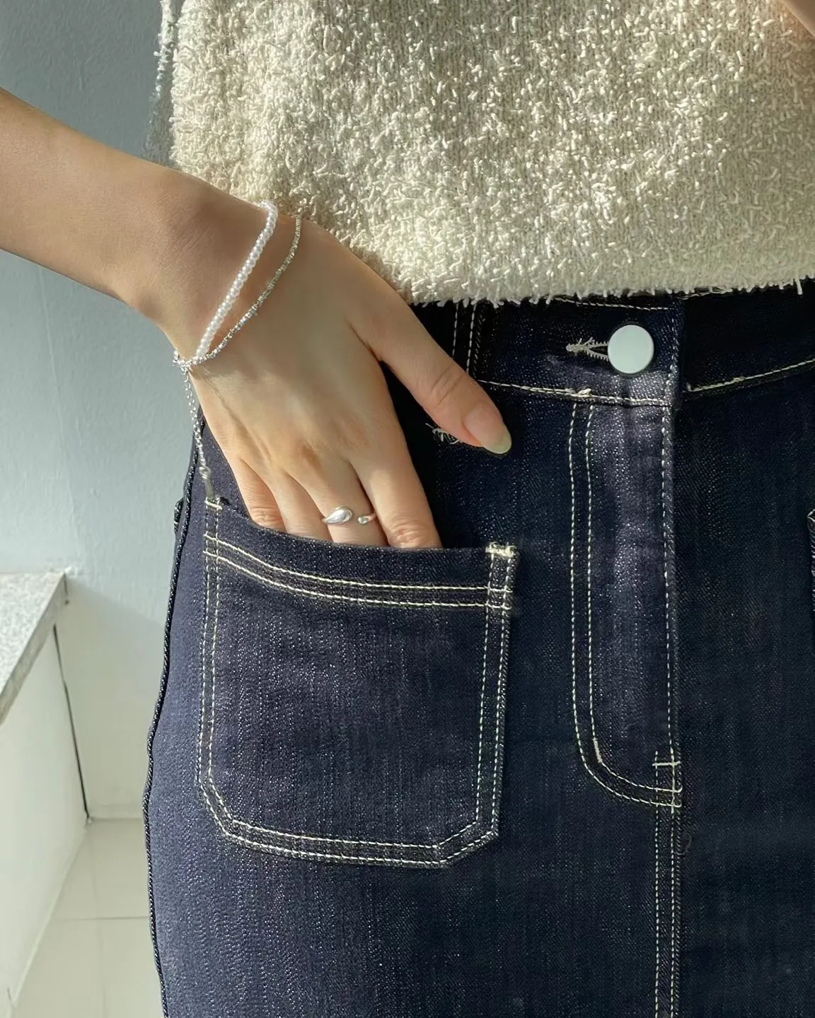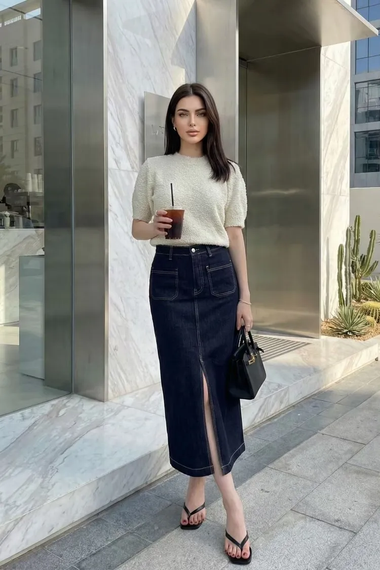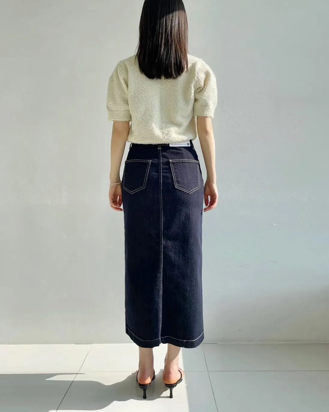 方形口袋車線前開杈牛仔裙