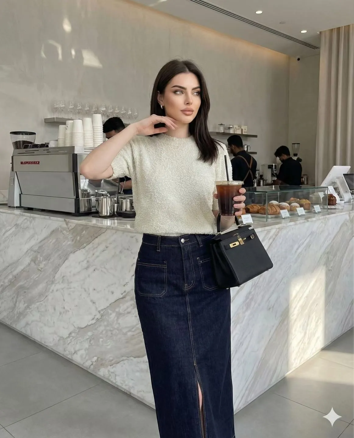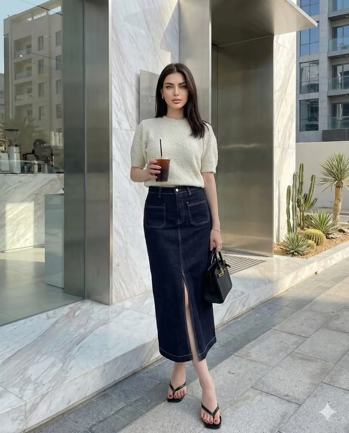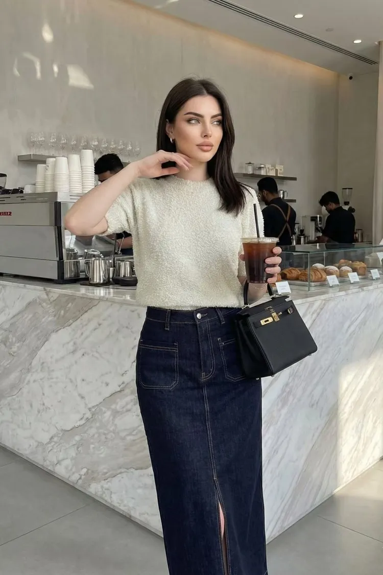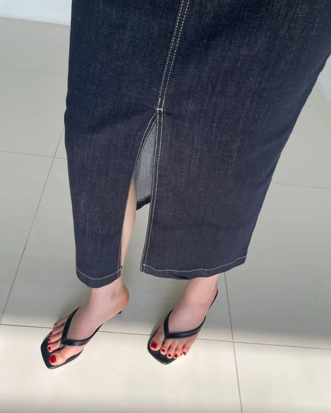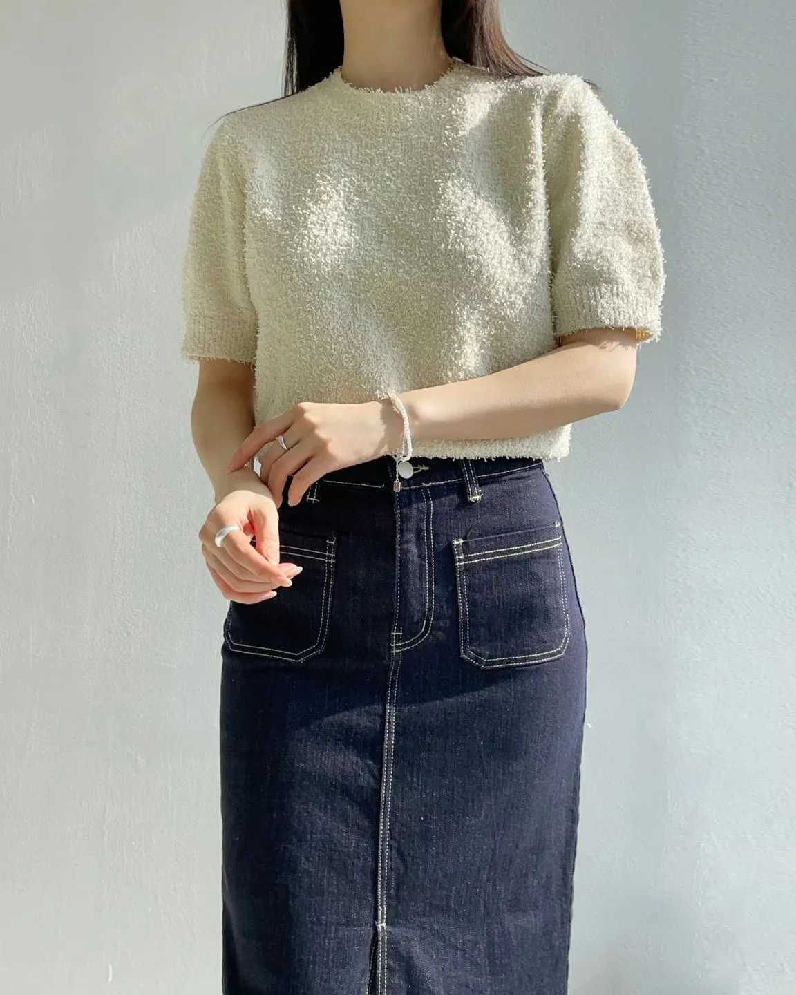 方形口袋車線前開杈牛仔裙