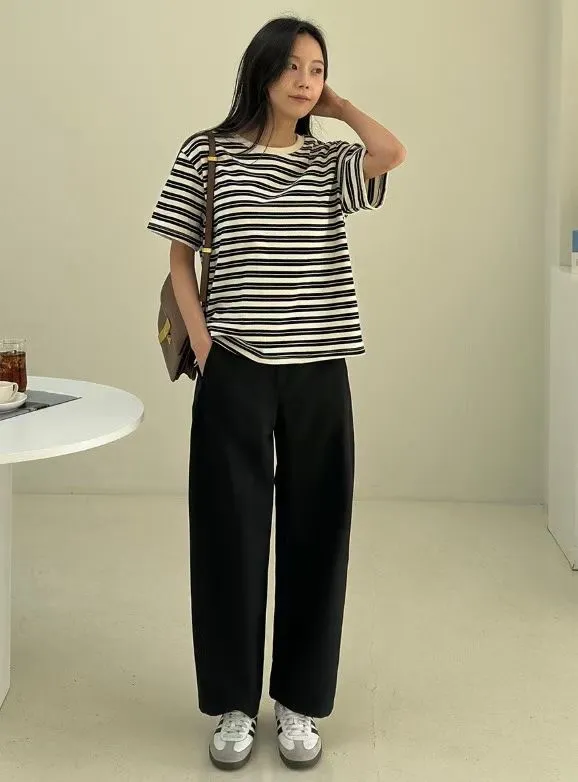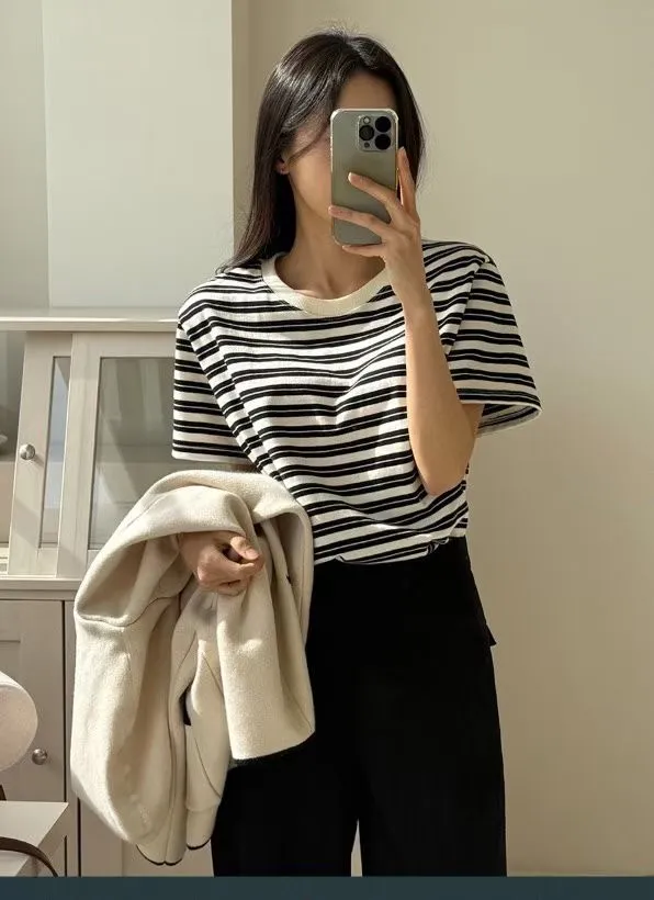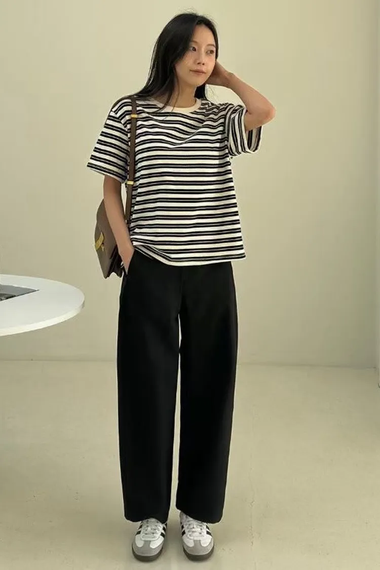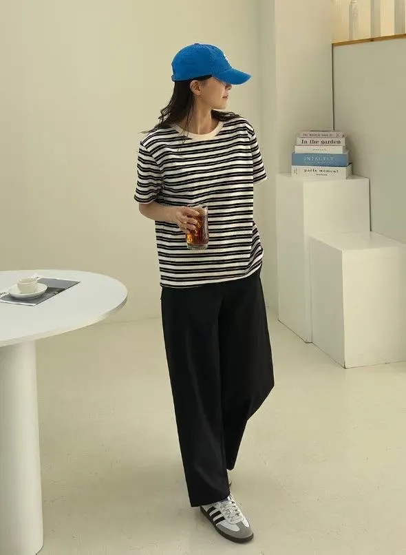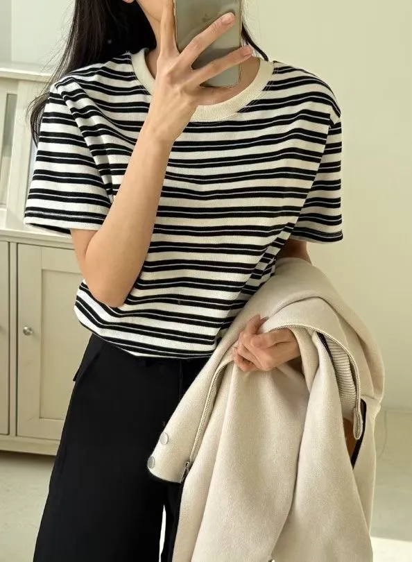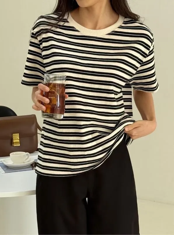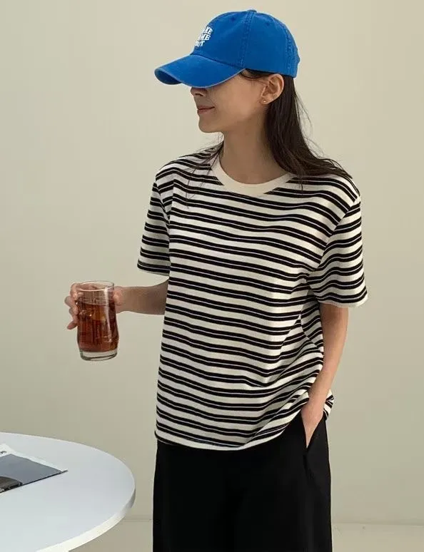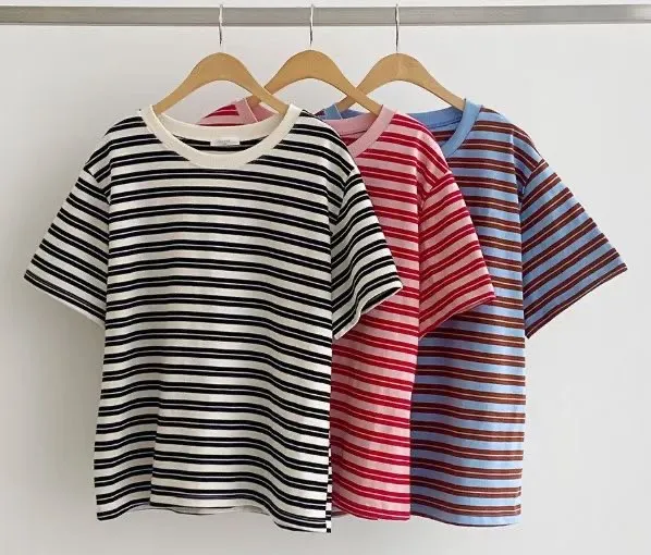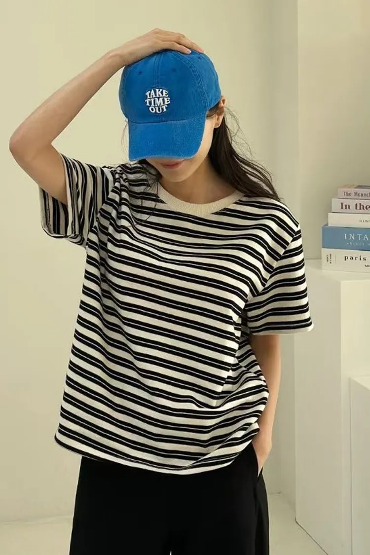 圓領滾邊配色條紋短袖T